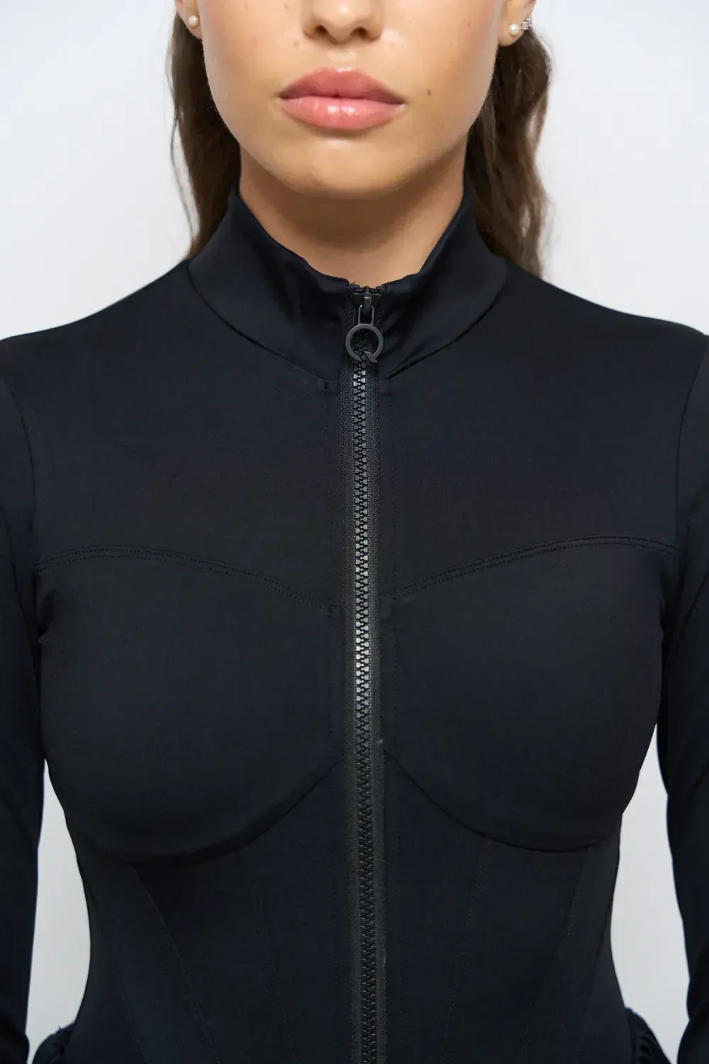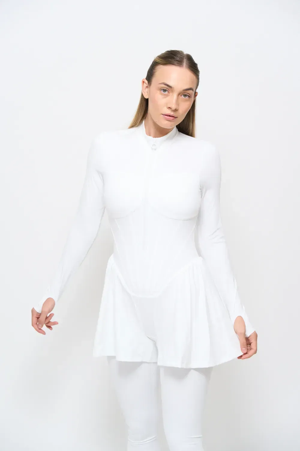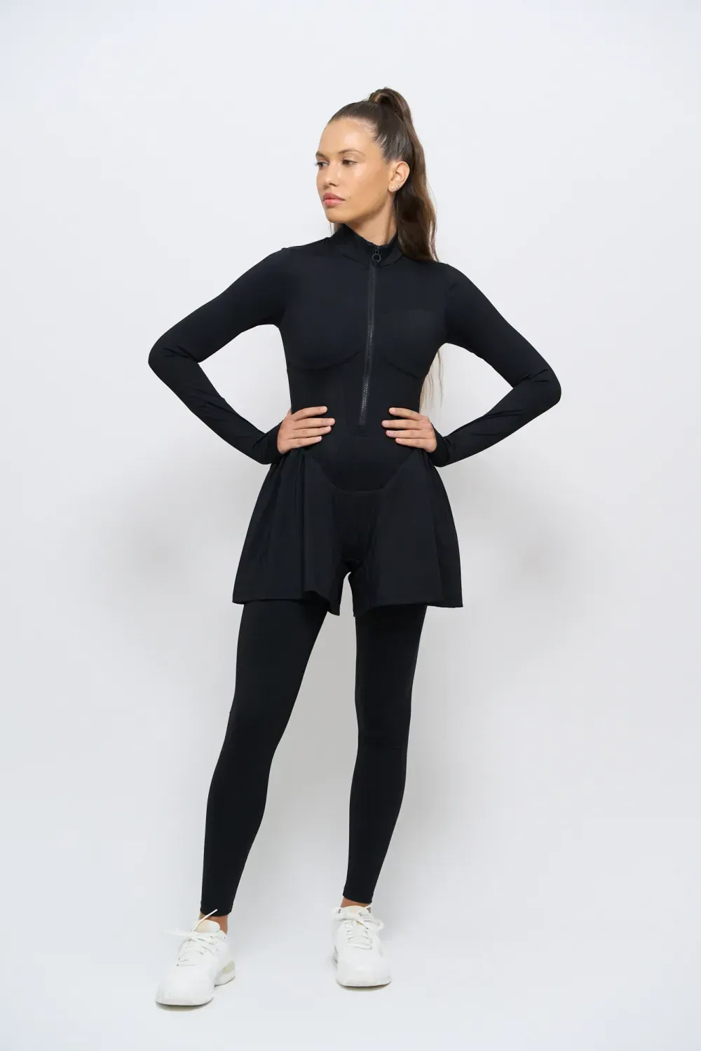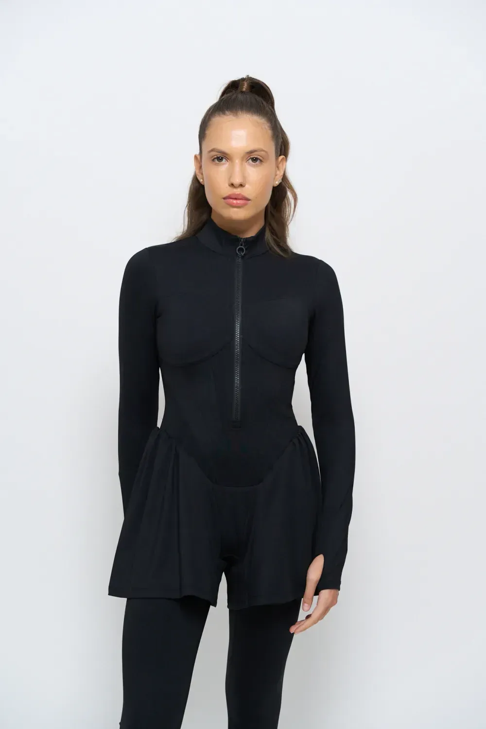 Tuta sportiva modellante a pezzo unico, con cerniera frontale. Il design integra leggings e maniche con foro per il pollice, creando una linea continua e armoniosa che scolpisce la figura.