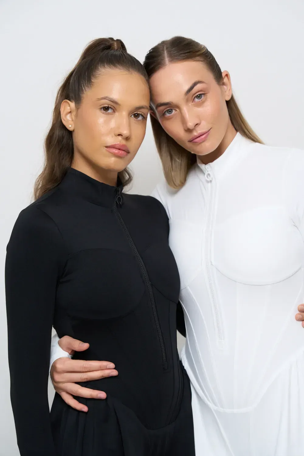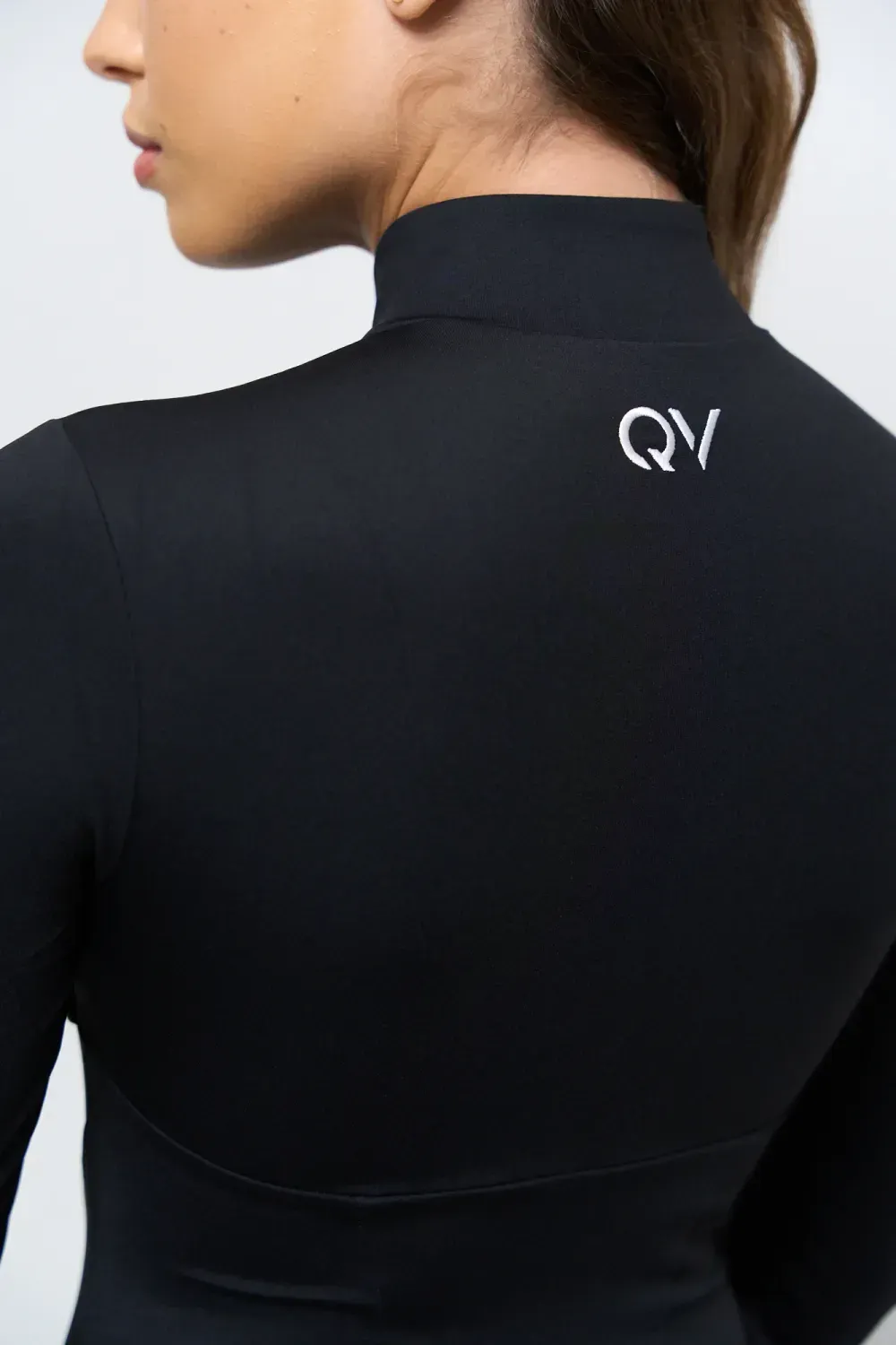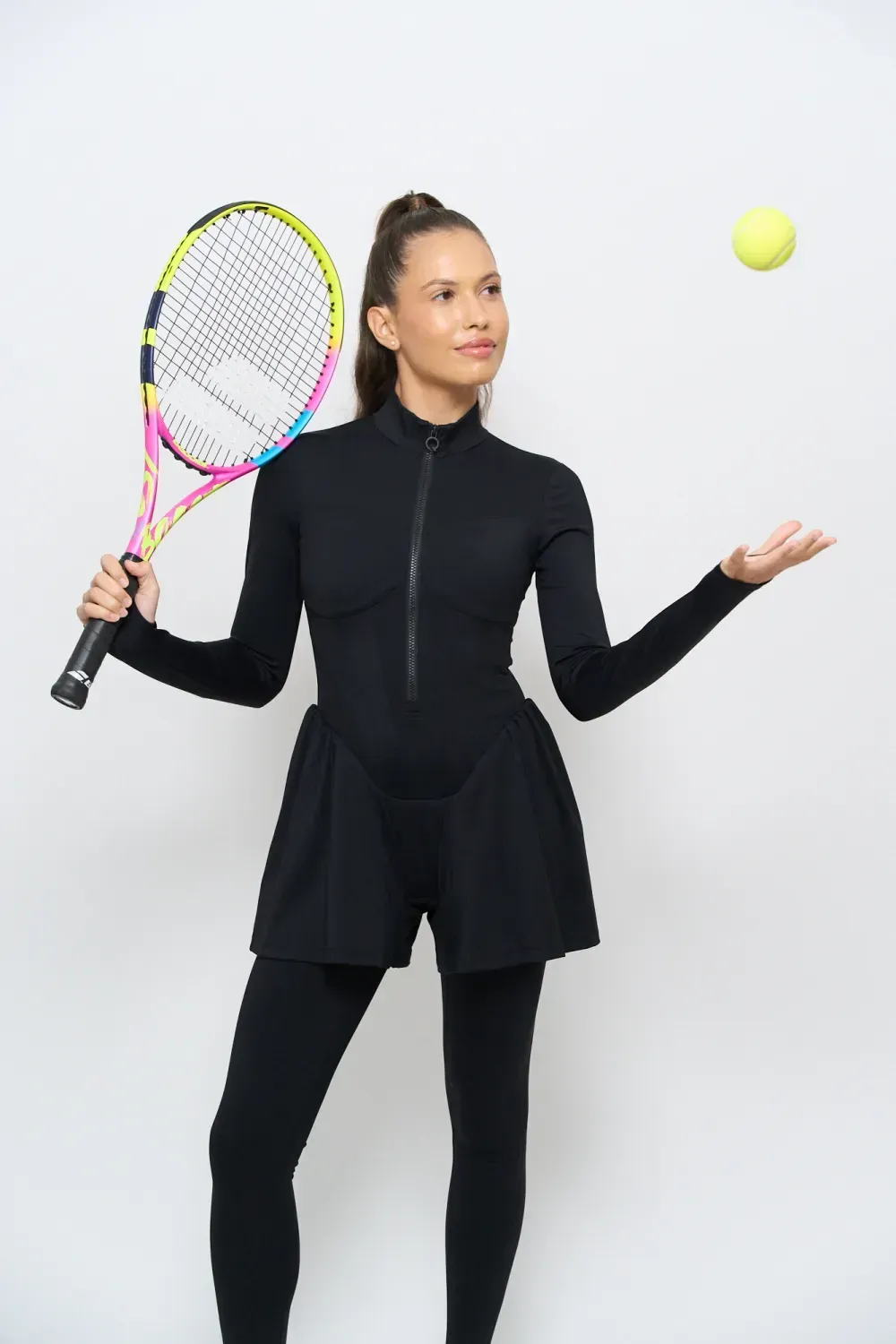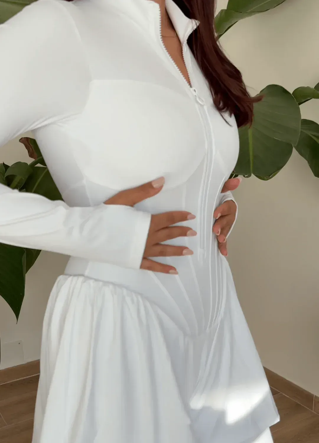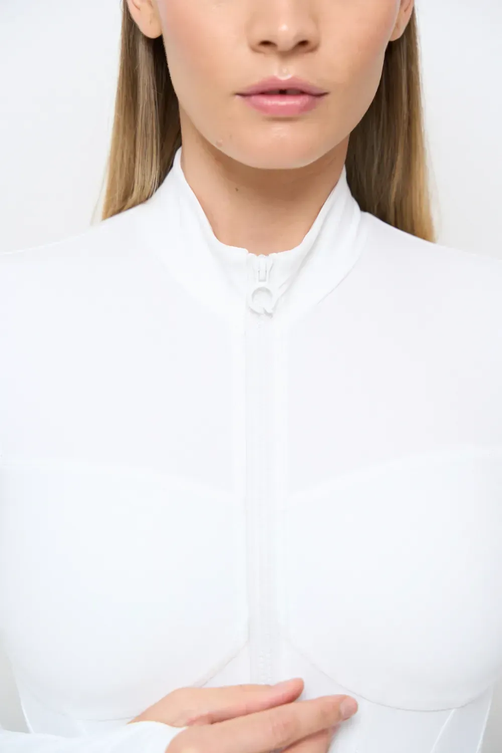 Tuta sportiva modellante a pezzo unico, con cerniera frontale. Il design integra leggings e maniche con foro per il pollice, creando una linea continua e armoniosa che scolpisce la figura.