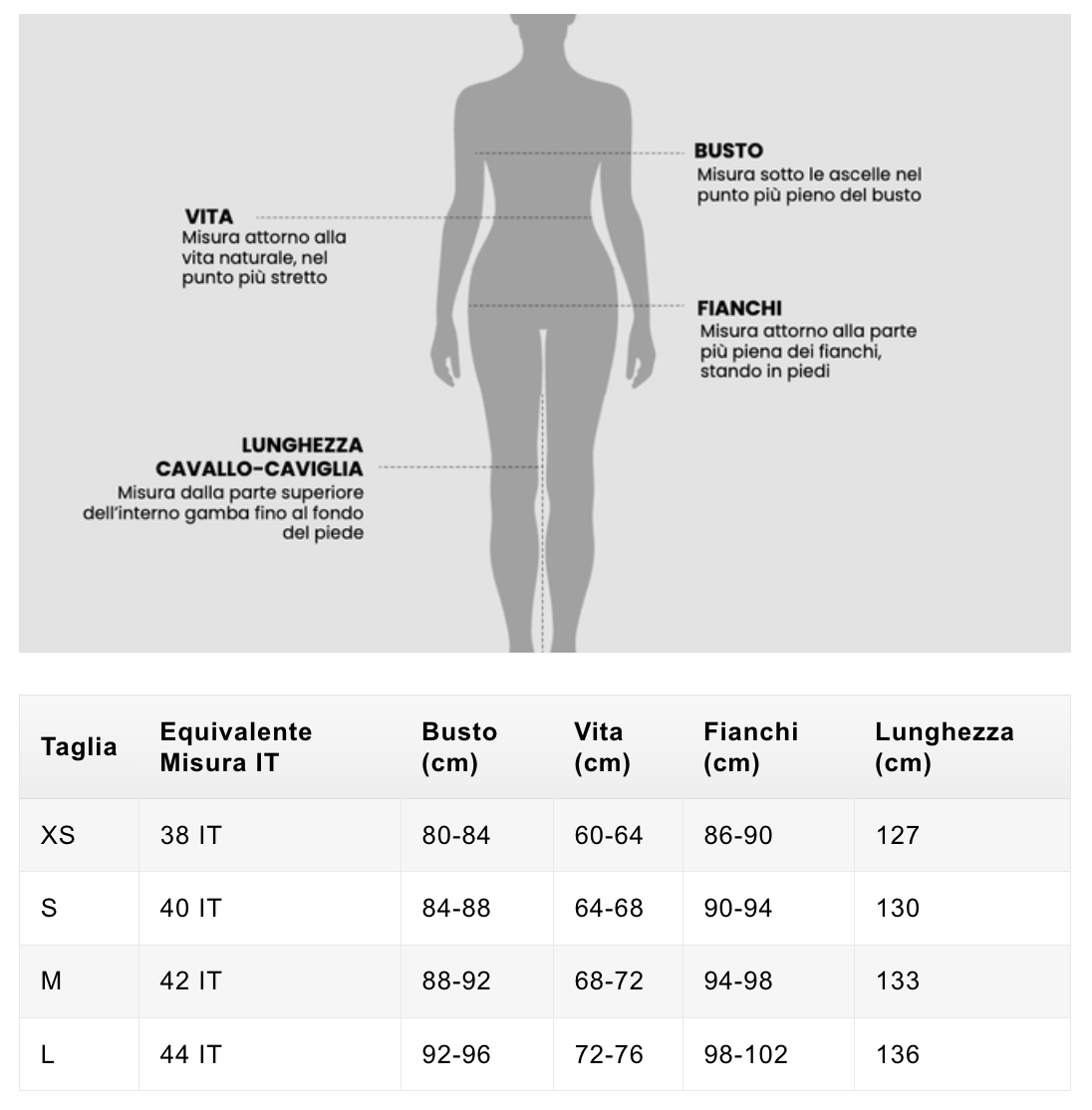 Tabella taglie (XS-L) e Comparazione Misure IT